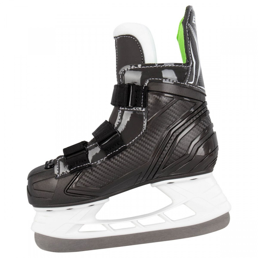 Вместо классической шнуровки ботинка в данной модели для фиксации стопы используются специальные эластичные ремешки с застежками на липучках, что позволяет быстро их одеть как в теплую, так и в холодную морозную погоду для катания на улице, лучше зафиксировать посадку на любой плотности носок, а самое важное – сэкономить время начинающих хоккеистам и родителям будущих чемпионов одеть коньки ребенку и удобно их снять после катания.